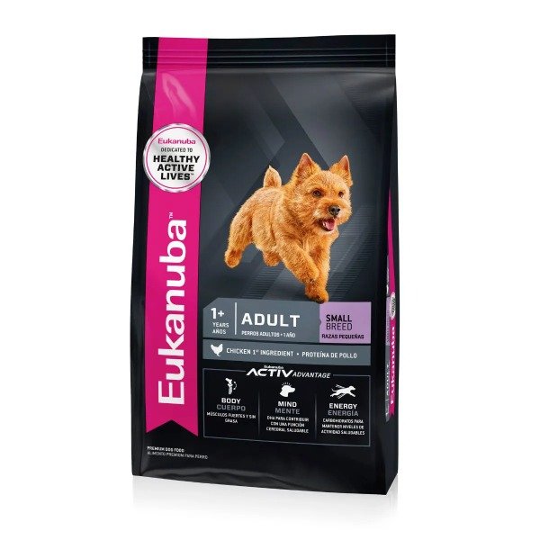 Eukanuba Adult Small Breed (1 kg) es un alimento Super Premium completo y balanceado, diseñado para perros adultos (mayores de 12 meses) de razas pequeñas (que pesan menos de 10 kg). Su fórmula es rica en proteínas y grasas, con Pollo como primer ingrediente (mínimo 27% de proteína), para satisfacer el metabolismo acelerado de estas razas y promover músculos magros. Incluye la tecnología DentaDefense® para reducir la formación de sarro, y un balance de carbohidratos para mantener niveles de energía saludables a lo largo del día.