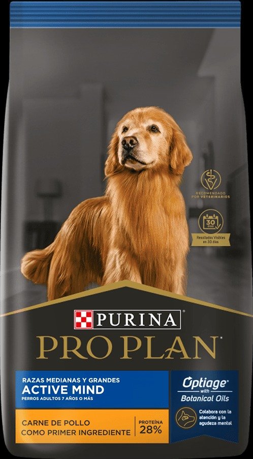 PRO PLAN ACTIVE MIND +7 (3 KG) es un alimento seco Super Premium para perros adultos mayores de 7 años (Senior), disponible para Razas Pequeñas y Razas Medianas/Grandes. Su característica distintiva es la tecnología Optiage (con Triglicéridos de Cadena Media - MCT) que provee una fuente alternativa de energía para el cerebro, ayudando a mejorar la memoria, la atención y la vitalidad en la etapa senior.