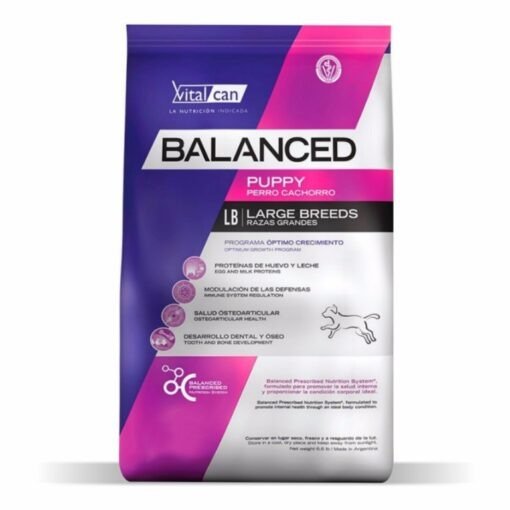 VITAL CAN BALANCED CACHORRO RAZA GRANDE (3 KG) es un alimento seco Premium, formulado bajo el Programa Óptimo Crecimiento para cachorros de razas grandes (hasta 18 meses de edad). Su composición incluye un contenido nutricional adaptado a su largo desarrollo, con proteínas de alto valor biológico de leche y huevo para la musculatura y un aporte de Glucosamina y Condroitín sulfato que protege las articulaciones, esenciales en razas grandes. Además, está enriquecido con Vitamina C y nucleótidos de levadura para modular las defensas y favorecer una óptima respuesta inmunológica durante esta etapa crucial.