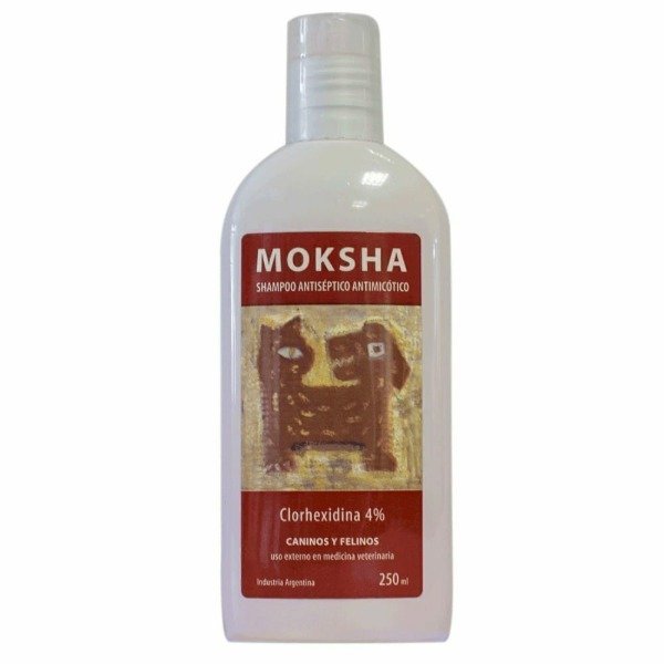 MOKSHA SHAMPOO ANTISÉPTICO CON CLORHEXIDINA X 250 ML. Acción: Antiséptico, Bactericida y Antimicótico de alta potencia. Este shampoo medicado presenta una alta concentración de Clorhexidina al 4%, que asegura una acción efectiva en el foco de la infección. Su fórmula está potenciada con el Extracto Soluble de Salvia para una acción antiséptica natural. Indicaciones: Es un coadyuvante esencial en el tratamiento de afecciones dermatológicas producidas por microorganismos sensibles a la Clorhexidina, incluyendo: Piodermias (infecciones bacterianas de la piel), Dermatitis, Dermatofitosis (tiñas por hongos), y levaduras como la Malassezia. Es una fórmula no irritante y efectiva incluso en presencia de materia orgánica. Especies: Apto para PERROS y GATOS. Modo de Uso Clave: Mojar el pelo, aplicar suficiente cantidad, frotar y dejar actuar la espuma entre 5 a 10 minutos antes de enjuagar con abundante agua. Uso: Producto terapéutico; debe ser utilizado bajo la estricta recomendación y frecuencia indicada por un médico veterinario.