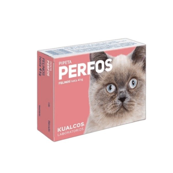 La Pipeta PERFOS FELINOS HASTA 4KG (comúnmente la versión Perfos Max del Laboratorio Kualcos) es un antiparasitario externo de aplicación tópica (spot-on) diseñado para gatos con un peso de hasta 4 kg. Contiene Imidacloprid como principio activo y su función es el control y tratamiento de las infestaciones por pulgas, actuando también como complemento en el tratamiento de la Dermatitis Alérgica por Picadura de Pulgas (DAPP). La dosis para este rango de peso suele venir en un pomo de 0,5 ml y se aplica directamente sobre la piel del animal en la zona de la nuca para una protección mensual.