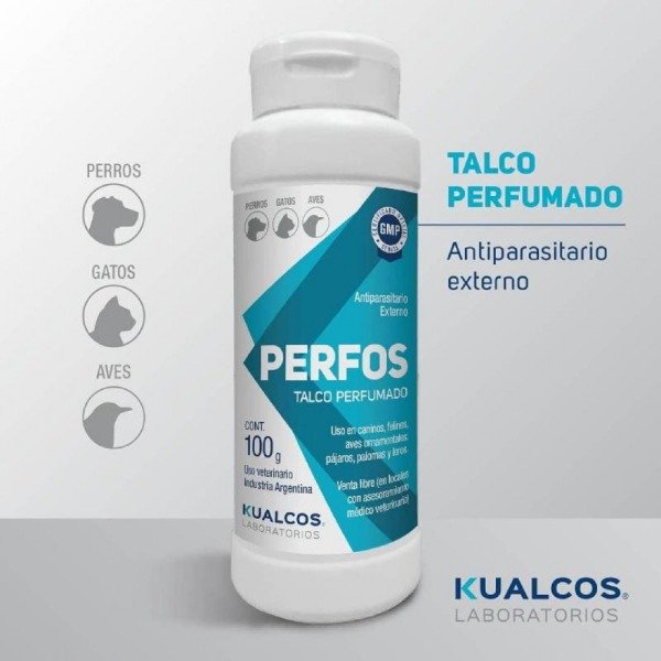 El PERFOS Talco Perfumado es un antiparasitario externo en polvo, presentado en una talquera de 100 g (no 100 ml), diseñado para el control y tratamiento de una amplia gama de ectoparásitos en caninos, felinos y aves ornamentales. Su formulación incluye principios activos como Carbaryl, D-Tetrametrina y Cifenotrina, que actúan de manera eficaz contra pulgas (Ctenocephalides spp.), garrapatas (Riphicephalus sanguineus), piojos y ácaros (en el caso de las aves). El talco se aplica espolvoreando directamente sobre el pelaje o plumaje del animal, asegurándose de que el producto entre en contacto con la piel, y se recomienda repetir el tratamiento una vez por semana o según indicación veterinaria, siendo también útil para aplicar en el lugar de descanso de las mascotas y así complementar el control ambiental.