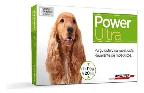 La Power Ultra Pipeta para perros de 11 a 20 kg es un tratamiento externo de tipo spot-on (de un solo punto de aplicación) diseñado para la prevención y el control de ectoparásitos. Su fórmula avanzada combina Imidacloprid y Permetrina (junto con Butóxido de Piperonilo como sinergizante), proporcionando una acción pulguicida (adulticida y larvicida), garrapaticida, piojicida y acaricida (para ácaros de la oreja), con un poder residual que generalmente dura de 4 a 6 semanas. Una característica distintiva de Power Ultra es su efecto repelente contra garrapatas, moscas (incluyendo la de la punta de la oreja) y mosquitos (flebotomos y culícidos), ayudando a prevenir enfermedades transmitidas por estos insectos. La presentación para este rango de peso contiene 3,50 ml de la solución y debe aplicarse directamente sobre la piel a lo largo del cuello, entre la nuca y el comienzo del dorso, siendo importante destacar que no debe utilizarse en gatos debido a la toxicidad de la Permetrina para la especie felina.